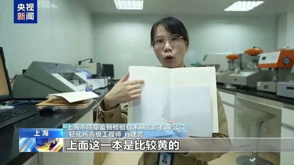 上海市质量监督检验技术研究院有限公司轻化所高级工程师 肖建芳:这两个本子,通过肉眼能够正常的看到上面这一本比较黄,下面这一本比较白,白得发亮。我们通过白度仪检测,看一下这两个本子的亮度值如何。