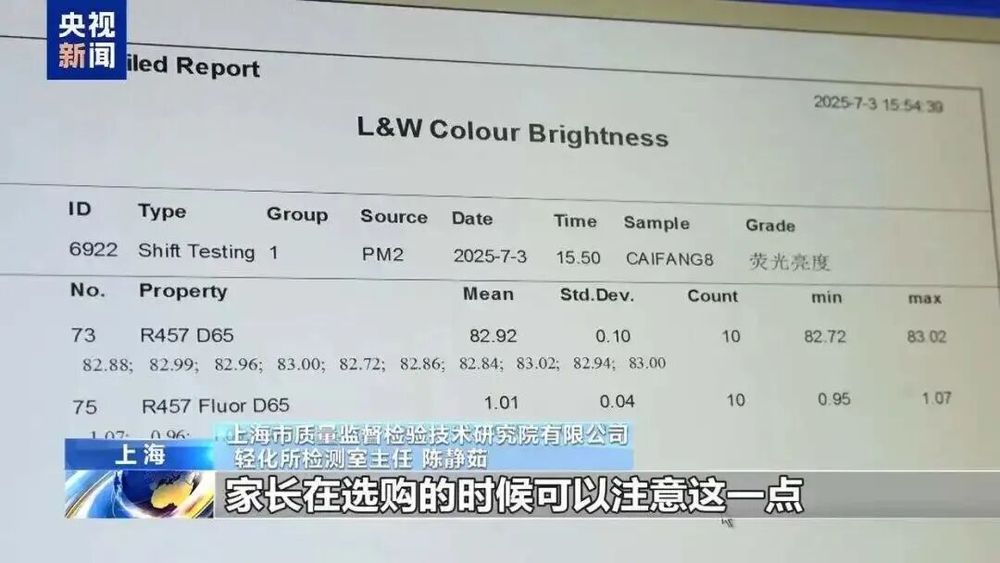 上海市质量监督检验技术研究院有限公司轻化所高级工程师 肖建芳:刚才我们对这一批复印纸进行了测试,能够正常的看到现在复印纸的D65亮度数值都超过了100%。国家对复印纸的D65亮度要求应该小于等于95.0%,现在已经大于100%了,远超过国家标准要求。而且学生用品对于D65亮度的要求应该小于等于85.0%,如果学生一旦用这种市面上所售卖的高亮度复印纸的话,经常使用可能会对视力产生不利影响。
